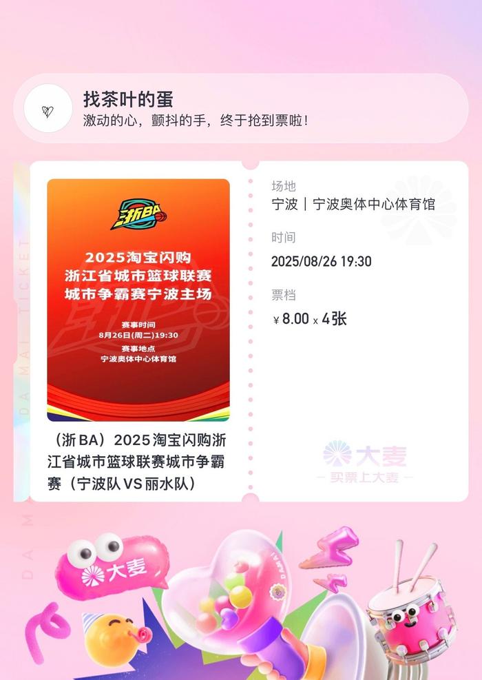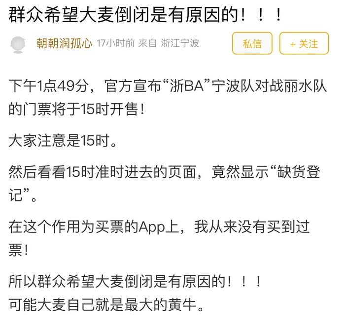 #浙BA宁波主场开票就秒空球迷大倒苦水# ,8月26日,宁波队 VS 丽水队的比赛将在宁波奥体中心开打,但在昨天的开票环节,却让不少朋友都很生气。热情的球迷买不到球票,大麦再次被吐槽,有些人从来没在上面买到过票……